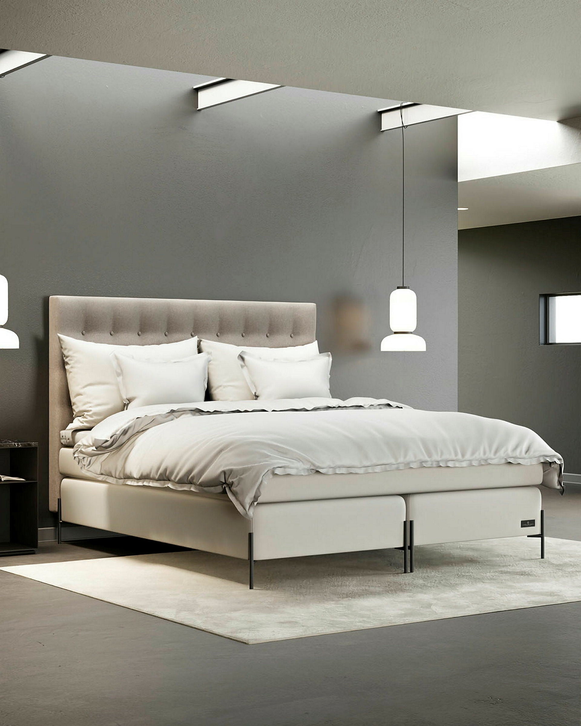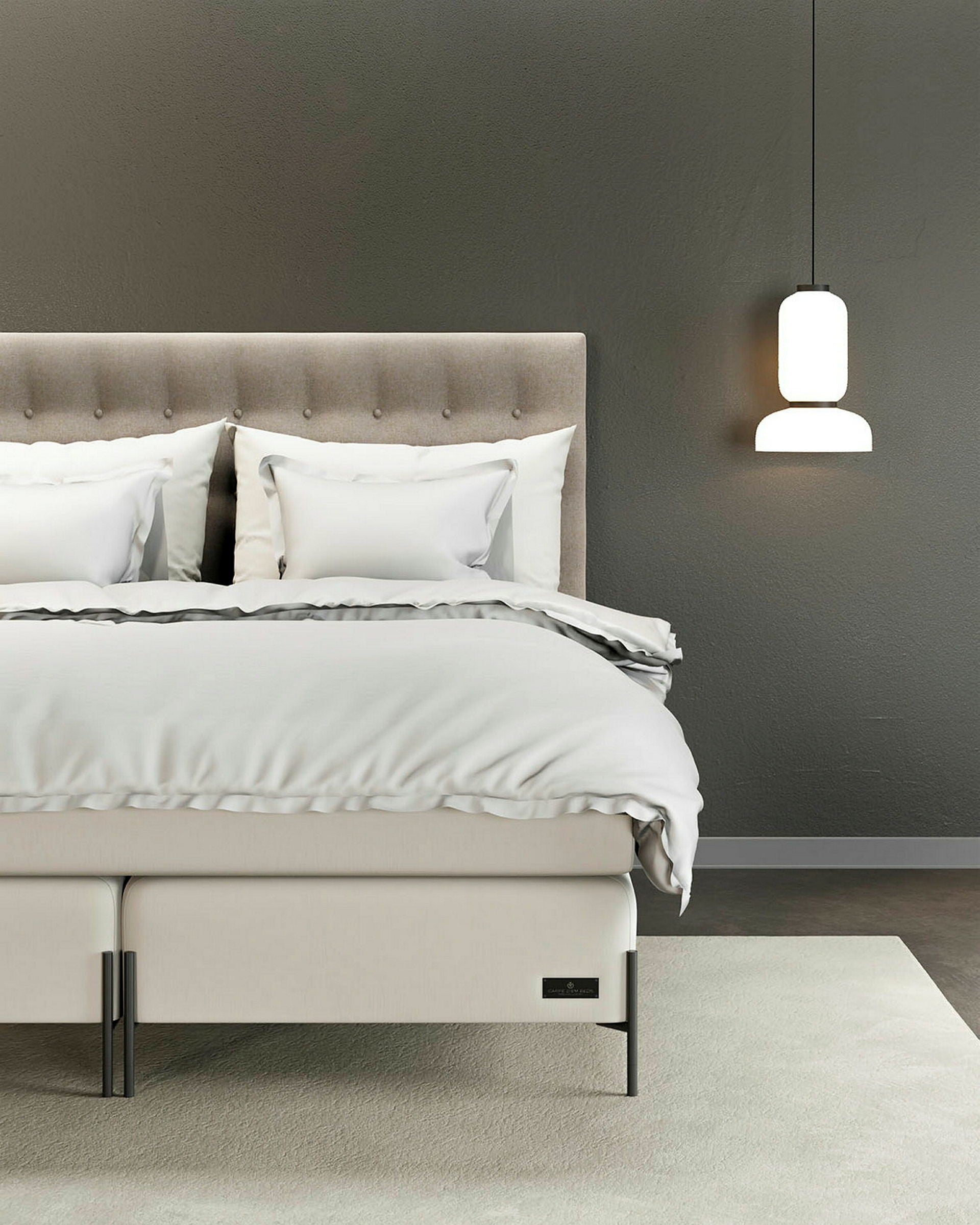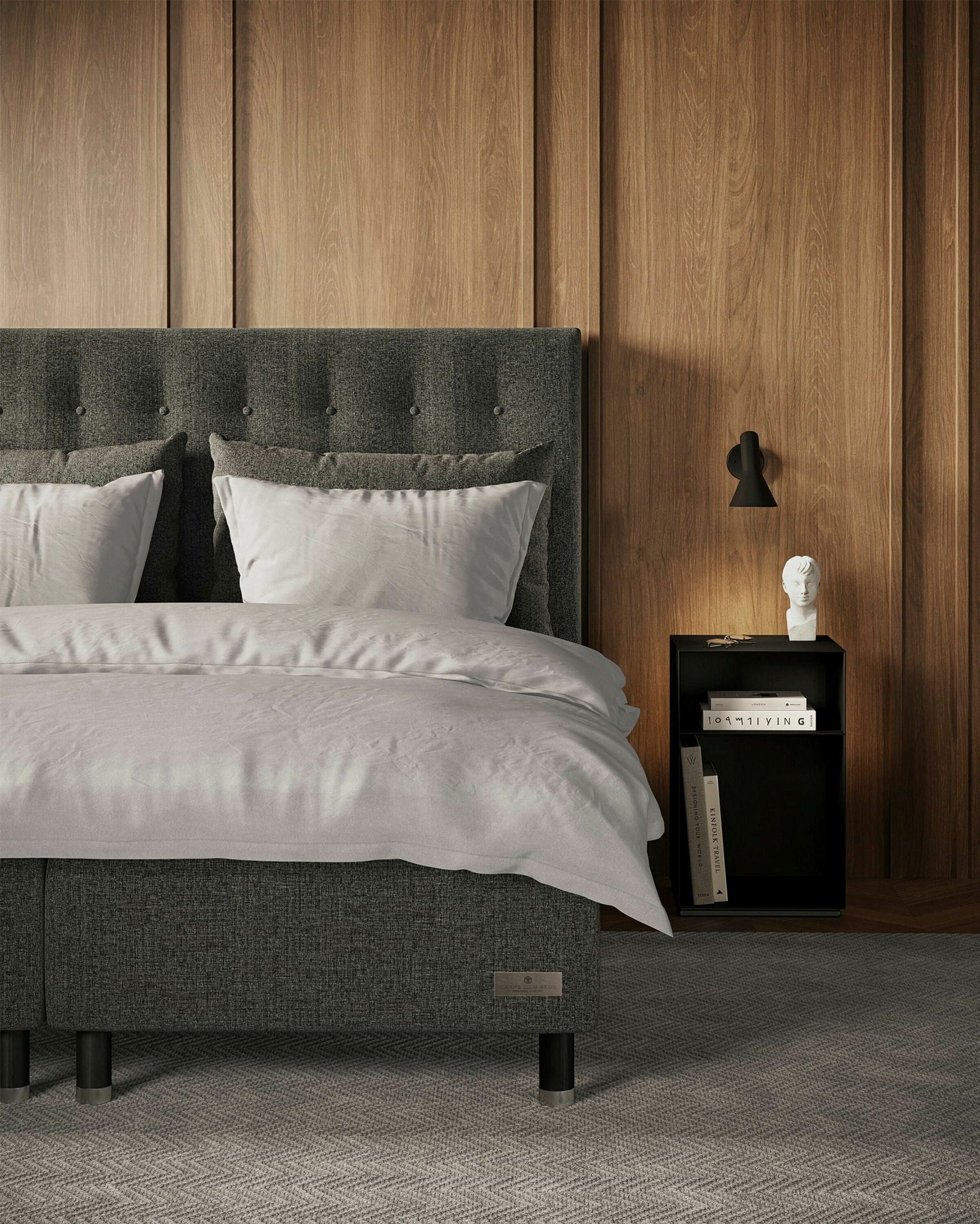 A modern, padded headboard with buttons. Available in several sizes. Choose from 44 exclusive fabrics in different colours. The Ängö headboard is hand-made in Sweden.