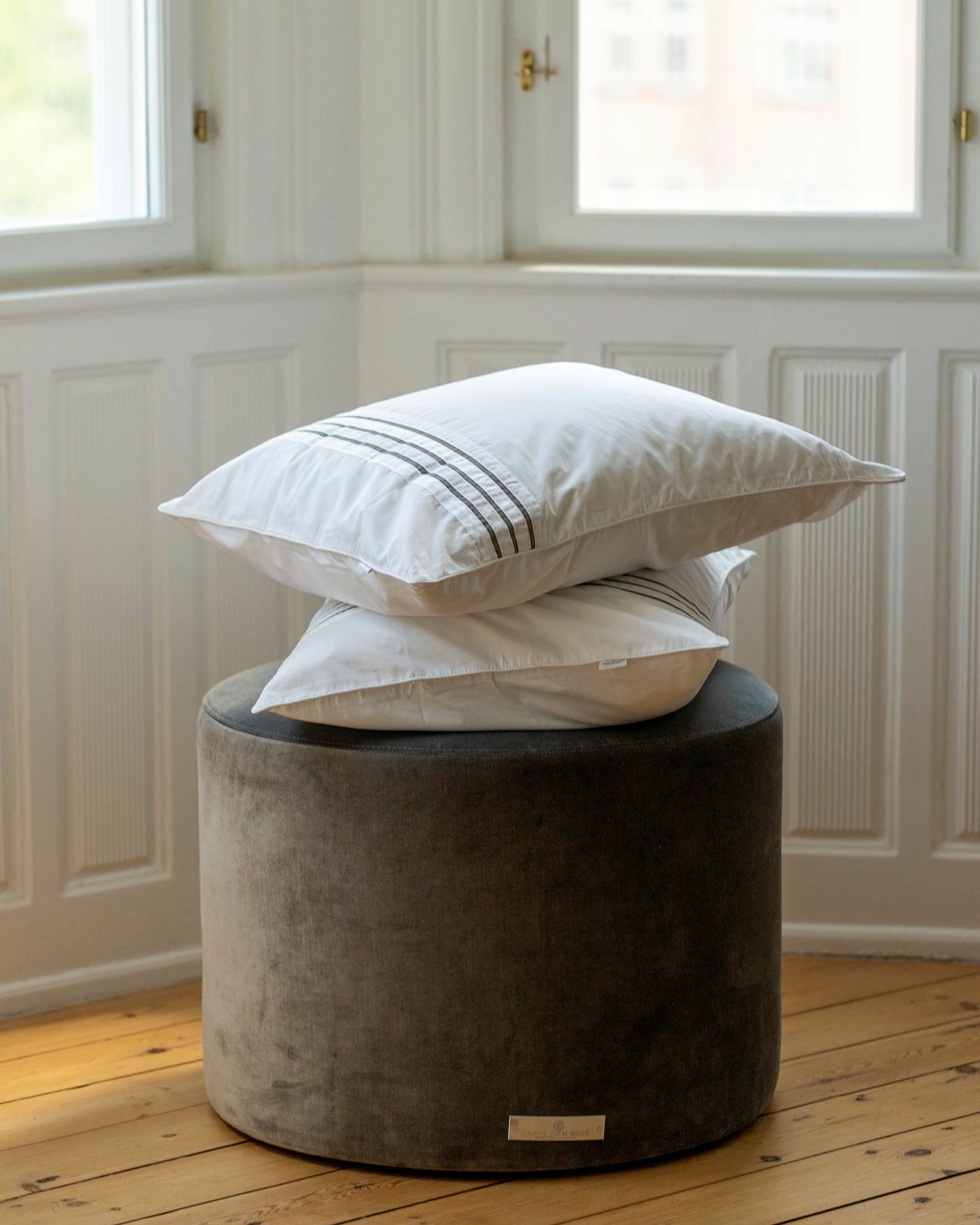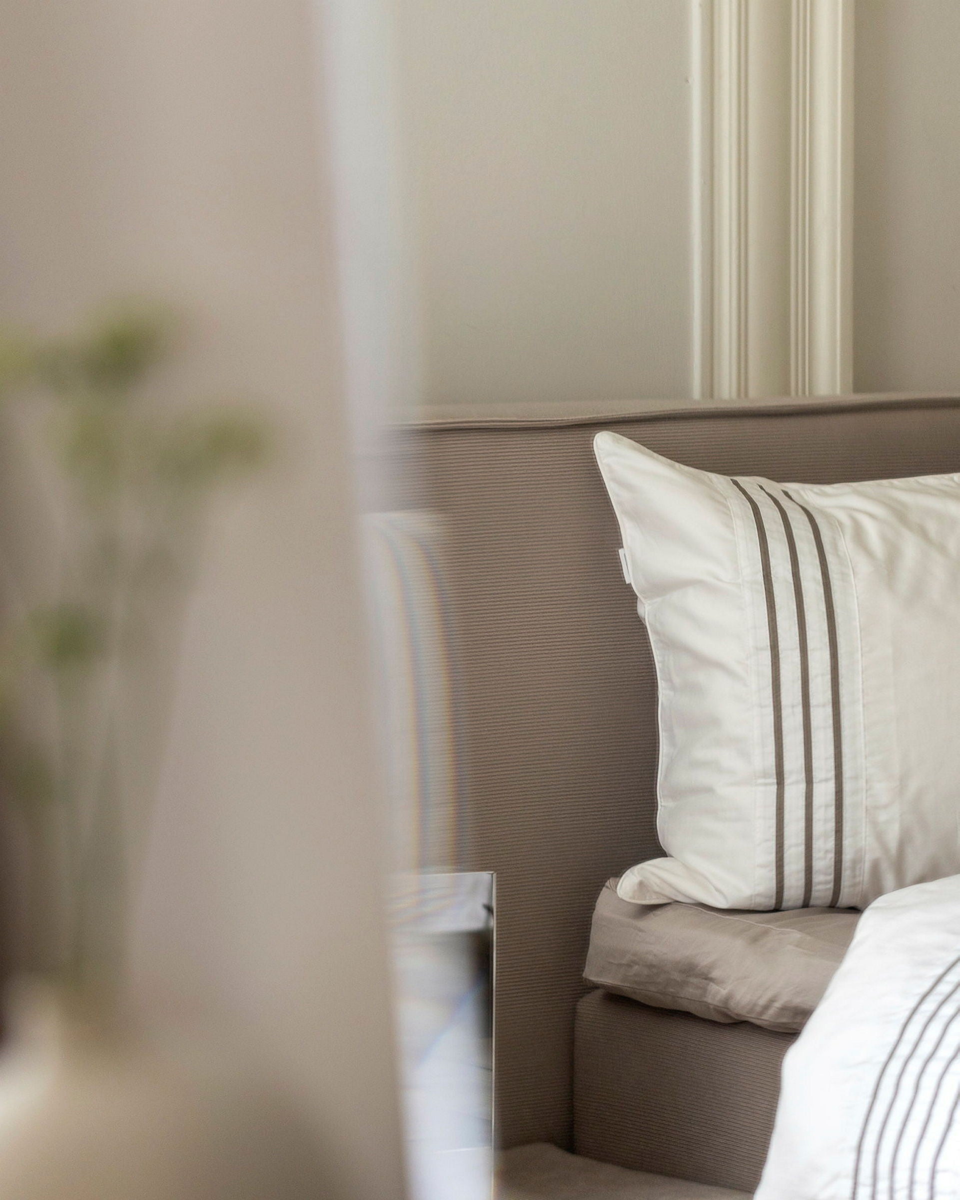 Exclusive pillowcase in white cotton satin with decorative grey lines, size 50x60. Made in Egyptian cotton with a thread count of over 300 threads per inch. Oeko-Tex® Standard 100 certified.